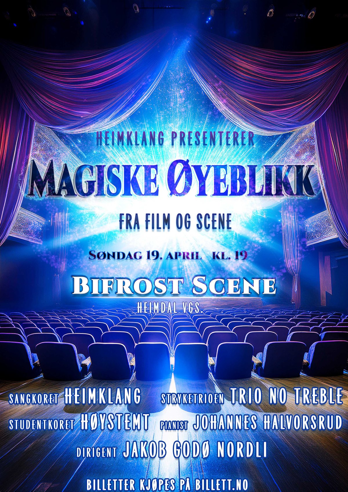 Søndag 19. april byr Heimklang på "Magiske øyeblikk fra film og scene". Sammen med profesjonelle musikere og de glade gutta fra studentkoret Høystemt byr vi på musikalske perler fra filmer og musikaler. Vi tar med noen smakebiter til Sjetnekorets kortreff i mars og på kortur til Ålesund i mai.